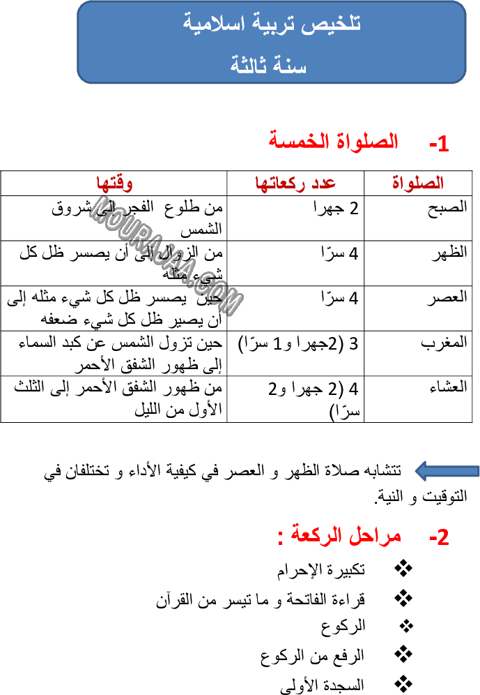 درس حول الصلوات الخمس - مراحل الركعة - نص التشهد - حسن الجوار في مادة تربية اسلامية لتلاميذ سنة ثالثة ابتدائي