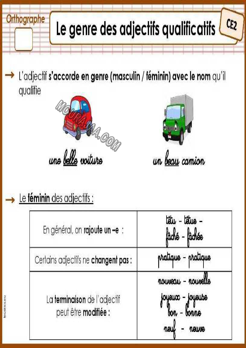 la leçon se deroule sur genre adjectif qualificatif pour aider l eleve de troisieme annee primaire Pour revoir ses cours et examens en le téléchargeant sous forme de fichier ou en le visualisant sous forme d'images