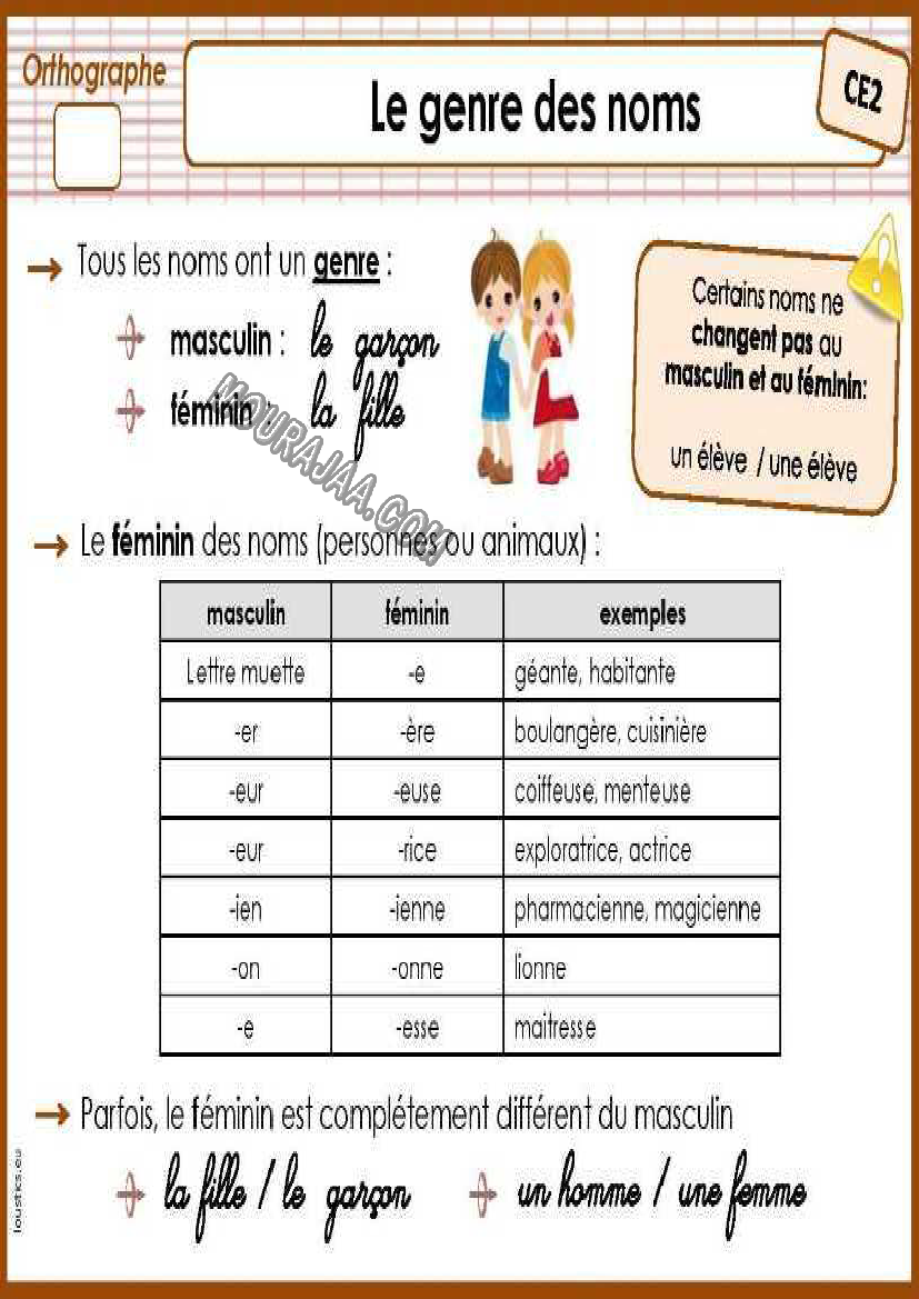 la leçon se deroule sur genre de nom pour aider l eleve de troisieme annee primaire Pour revoir ses cours et examens en le téléchargeant sous forme de fichier ou en le visualisant sous forme d'images