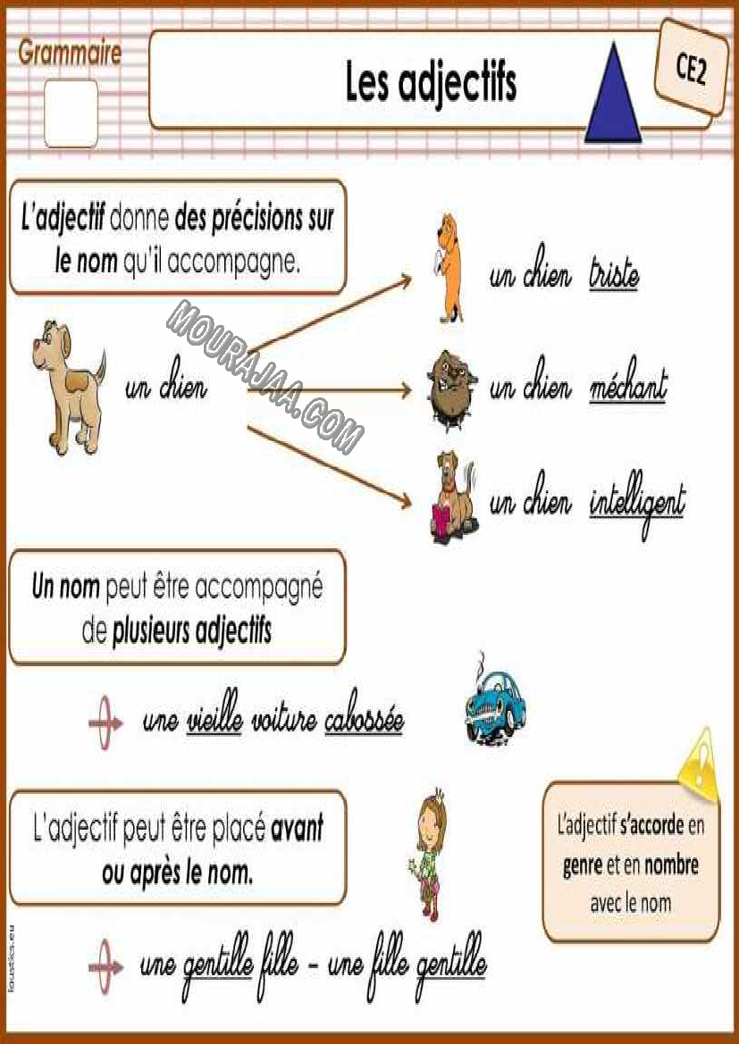 La leçon consiste à définir et résumer les adjectifs et des informations à ce sujet avec des images pour simplifier la leçon les adjectifs au matiere lect_fr pour troisieme annee primaire .