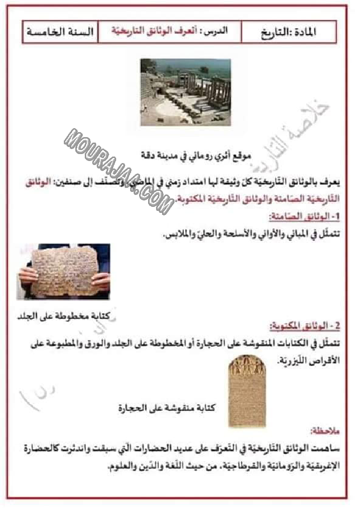 يتحدث الدرس على اتعرف على الوثائق التاريخية لمساعدة تلميذ سنة خامسة ابتدائي في مراجعة دروسه و امتحاناته و ذلك عبر تحميله في صيغة ملف او مشاهدته في صيغة صور