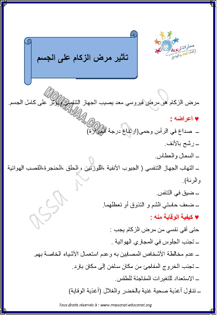 درس حول تاثير مرض الزكام في مادة ايقاظ علمي لتلاميذ سنة رابعة ابتدائي