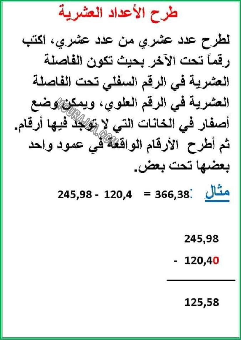 و يتمثل الدرس في تعريف و تلخيص طرح الاعداد العشرية و معلومات حوله مع صور لتبسيط درس طرح الاعداد العشرية في مادة رياضياتلسنة سادسة ابتدائي