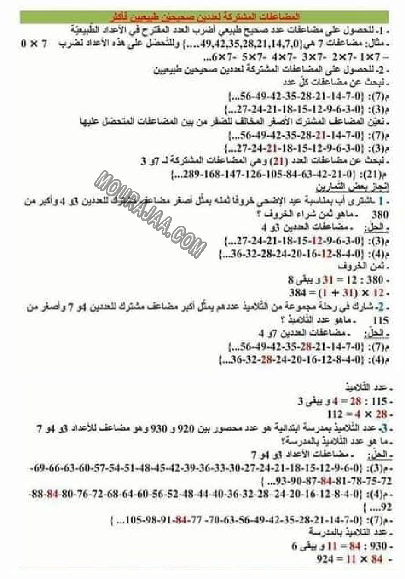 المضاعفات المشتركة هو عنوان لمحور درس مادة رياضياتلسنة سادسة ابتدائي