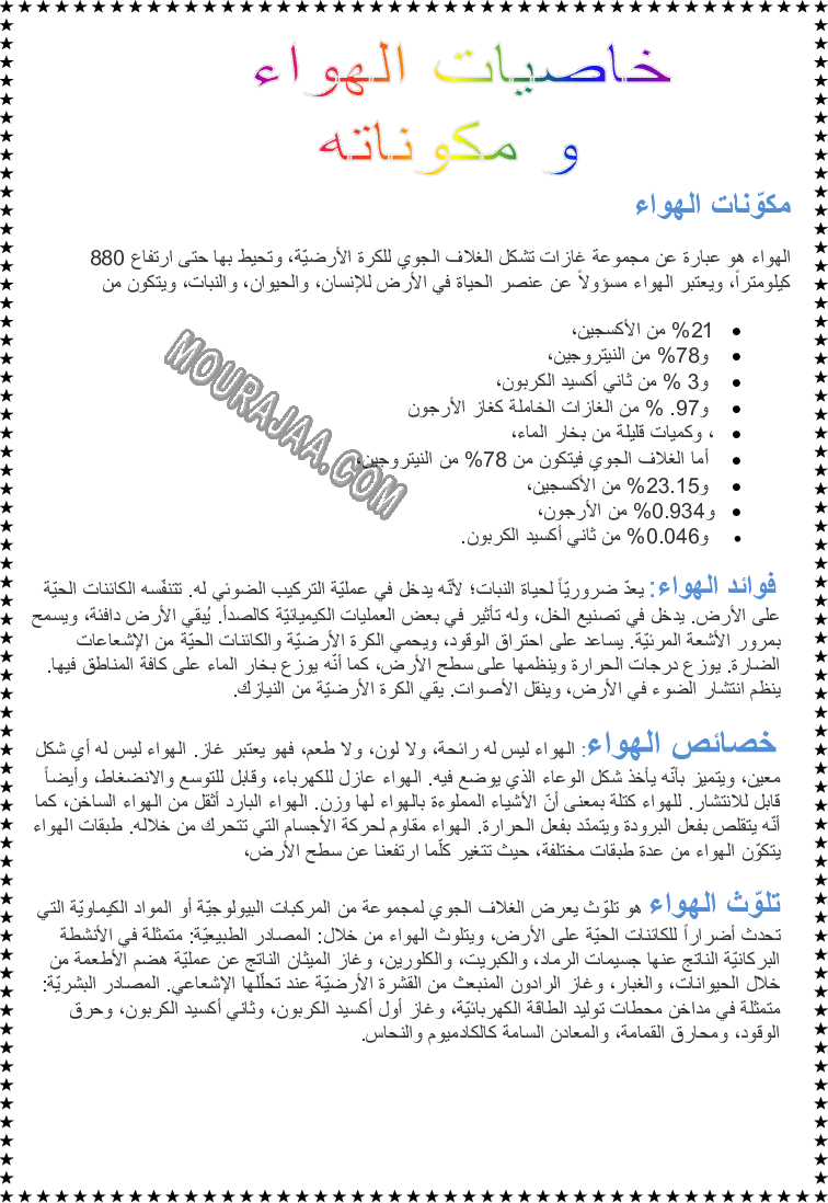 و يتمثل البحث تعريف مكوّنات الهواء و معلومات حوله مع صور لتبسيط درس مكوّنات الهواء في مادة االايقاظ العلمي لسنة سادسة ابتدائي