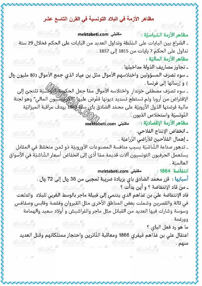 تونس في القرن 19 هو عنوان لمحور درس مادة تاريخلسنة خامسة ابتدائي