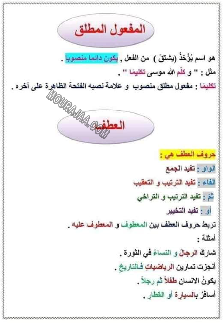 و يتمثل الدرس في تعريف و تلخيص المفعول المطلق و العطف و معلومات حوله مع صور لتبسيط درس المفعول المطلق و العطف في مادة لغةلسنة خامسة ابتدائي