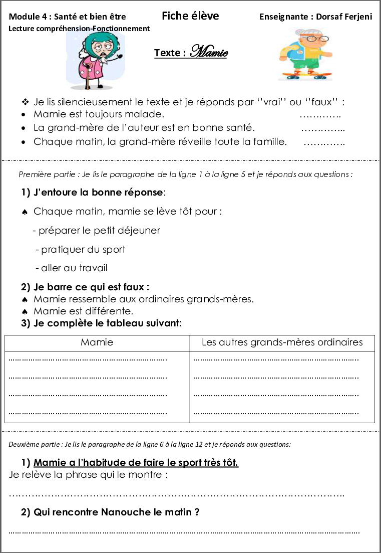 leçon texte mamie au matiere lect_fr pour les eleves de quatrieme annee primaire .