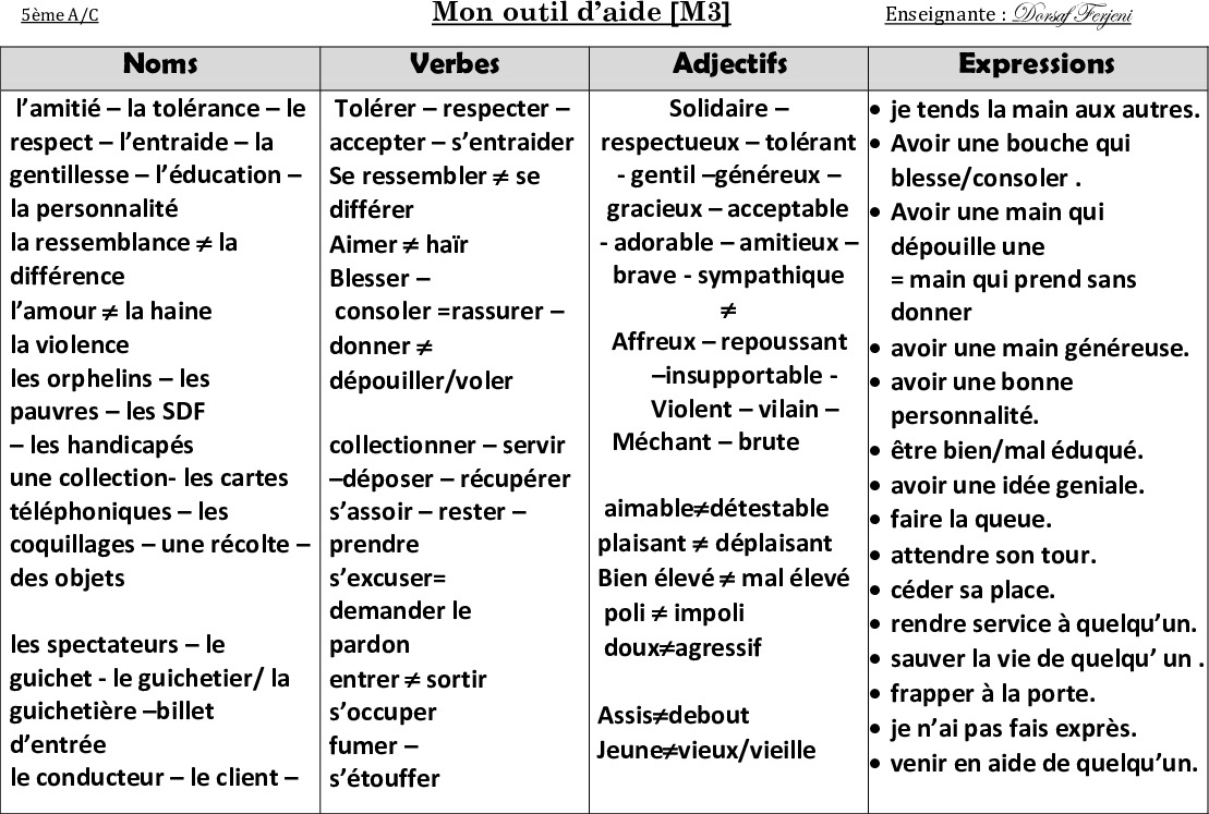 Le but de résumer la leçon Mon-outil-daide-M3-1 est d aider l eleve de quatrieme annee primaire de bien comprendre la lecon en réalisant les relations entre les parties de leçon Mon-outil-daide-M3-1 Et de creation d'une image globale sur la leçon en passant par ses parties, ce qui conduit à une meilleure compréhension de la leçon, et ainsi l'eleve de quatrieme annee primaire de contruire une connaissance complète des concepts de la matiere lect_fr et la compréhension et la perception de leçon Mon-outil-daide-M3-1