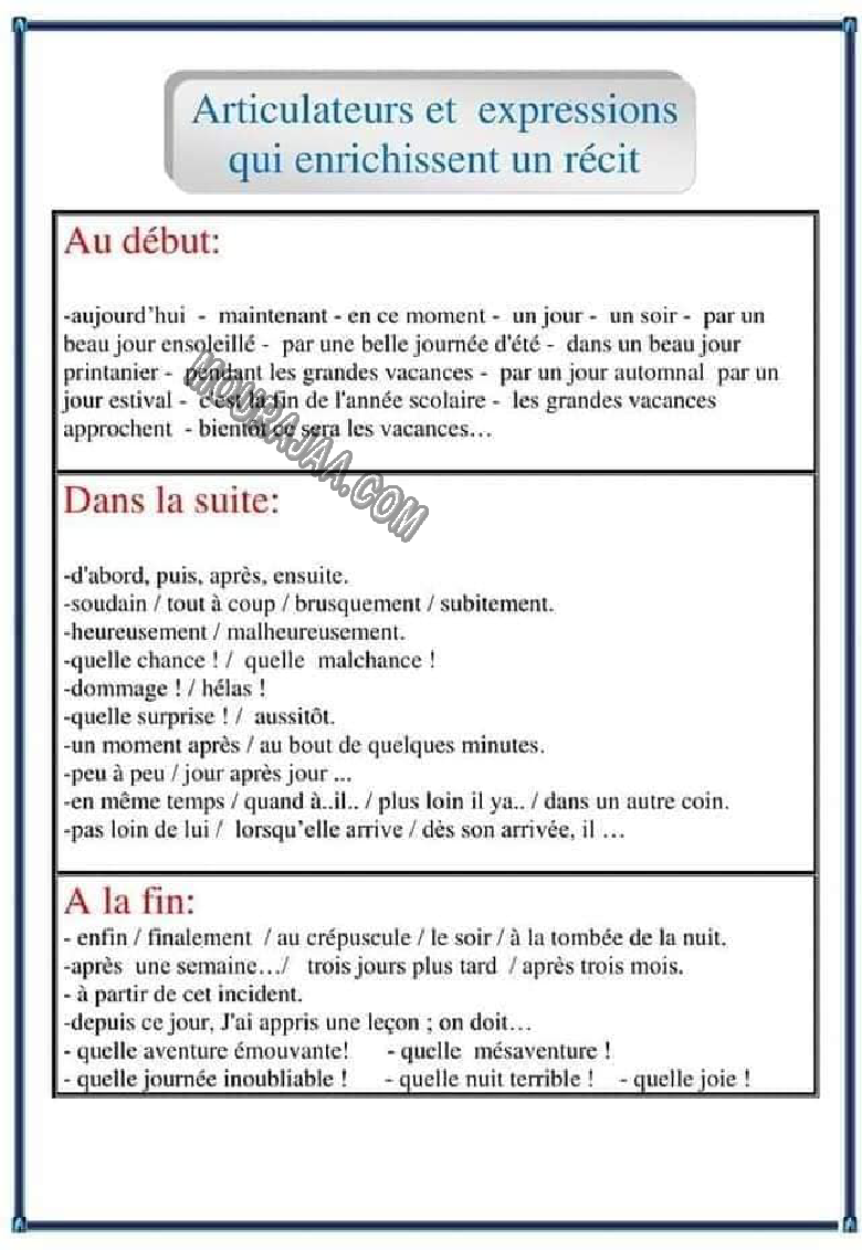 Le but de résumer la leçon developement est d aider l eleve de quatrieme annee primaire de bien comprendre la lecon en réalisant les relations entre les parties de leçon developement Et de creation d'une image globale sur la leçon en passant par ses parties, ce qui conduit à une meilleure compréhension de la leçon, et ainsi l'eleve de quatrieme annee primaire de contruire une connaissance complète des concepts de la matiere exp_fr et la compréhension et la perception de leçon developement