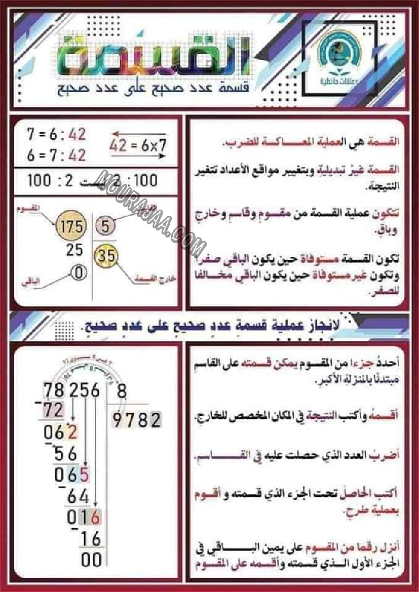 و يتمثل الدرس في تعريف و تلخيص القسمة و معلومات حوله مع صور لتبسيط درس القسمة في مادة رياضياتلسنة خامسة ابتدائي