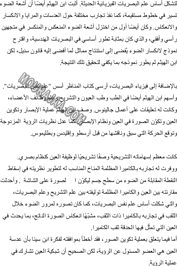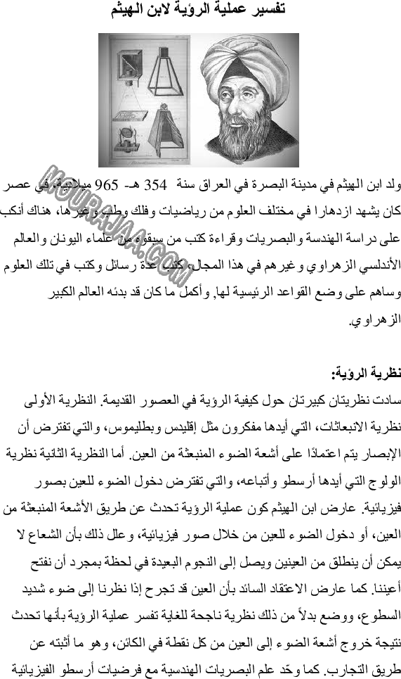 و يتمثل البحث تعريف تفسير عملية الرؤية لابن الهيثم و معلومات حوله مع صور لتبسيط درس تفسير عملية الرؤية لابن الهيثم في مادة االايقاظ العلمي لسنة خامسة ابتدائي