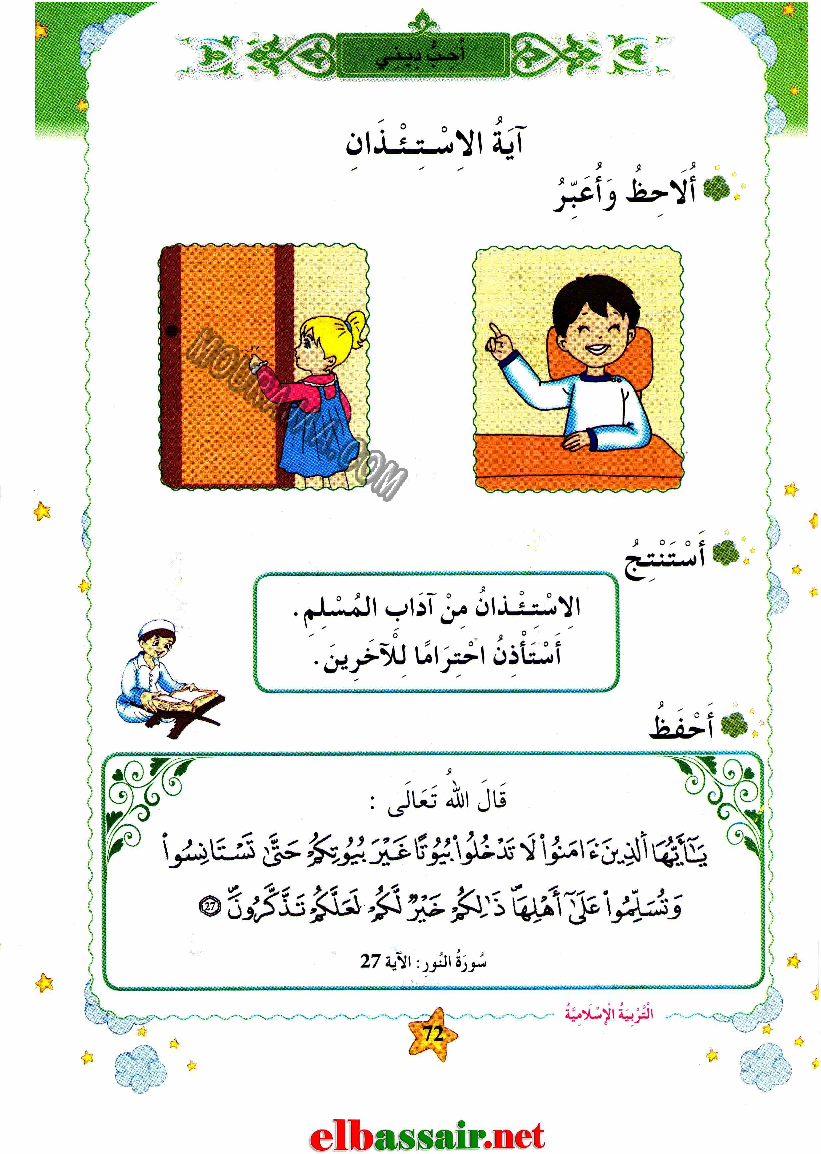 و يتمثل الدرس في تعريف و تلخيص آية الاستئذان و معلومات حوله مع صور لتبسيط درس آية الاستئذان في مادة تربية اسلاميةلسنة ثانية ابتدائي