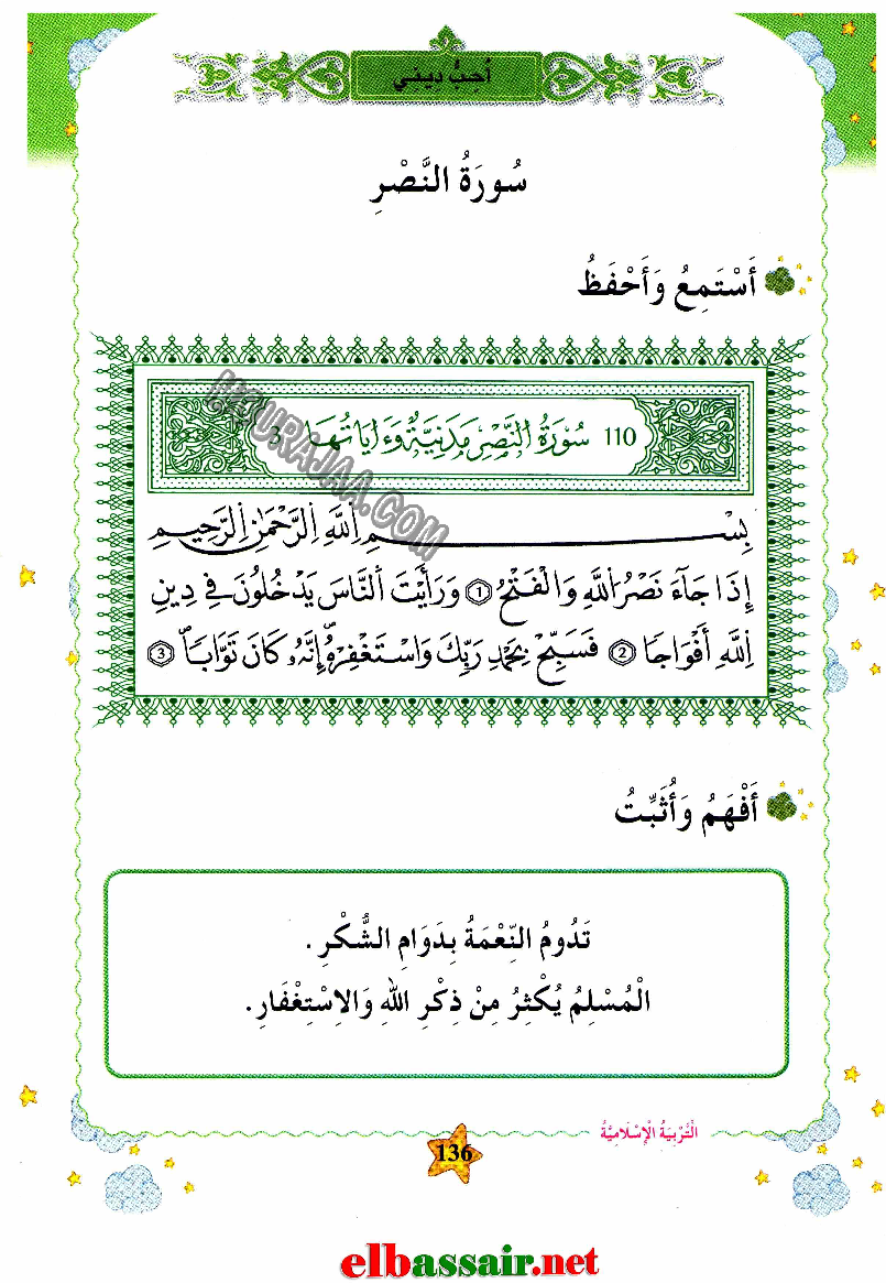 سورة النصر هو عنوان لمحور درس مادة تربية اسلاميةلسنة ثانية ابتدائي