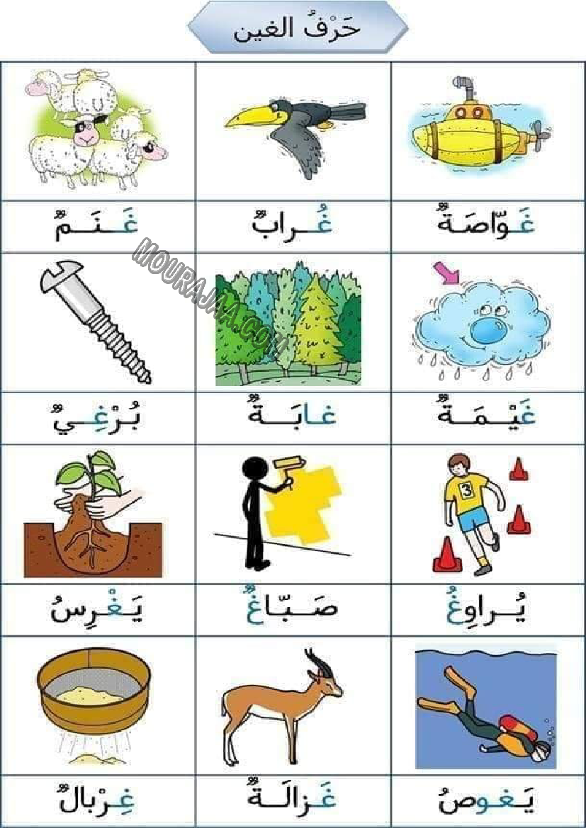 يتحدث الدرس على كلمات بحرف الغين لمساعدة تلميذ سنة أولى ابتدائي في مراجعة دروسه و امتحاناته و ذلك عبر تحميله في صيغة ملف او مشاهدته في صيغة صور