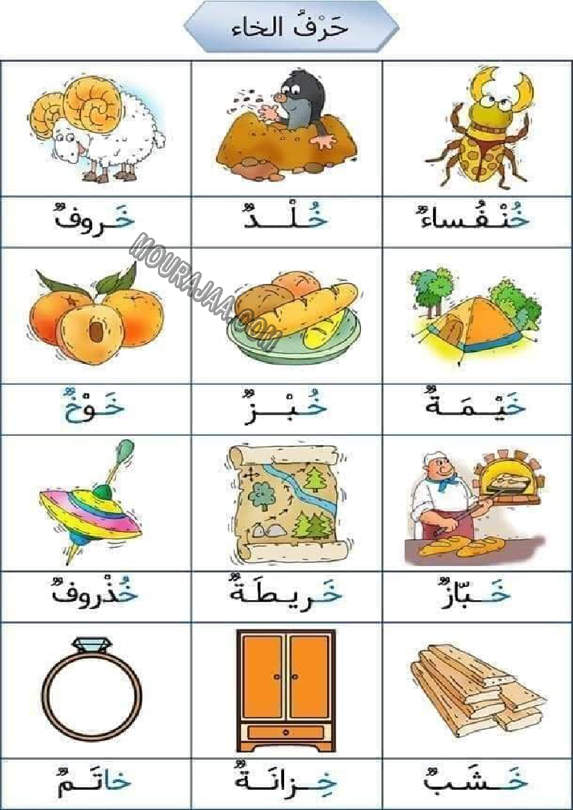 يتحدث الدرس على كلمات حرف الخاء لمساعدة تلميذ سنة أولى ابتدائي في مراجعة دروسه و امتحاناته و ذلك عبر تحميله في صيغة ملف او مشاهدته في صيغة صور