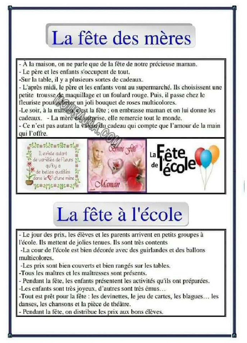 يتحدث البحث على fete des mere لمساعدة تلميذ سنة رابعة ابتدائي في مراجعة دروسه و امتحاناته و ذلك عبر تحميله في صيغة ملف او مشاهدته في صيغة صور