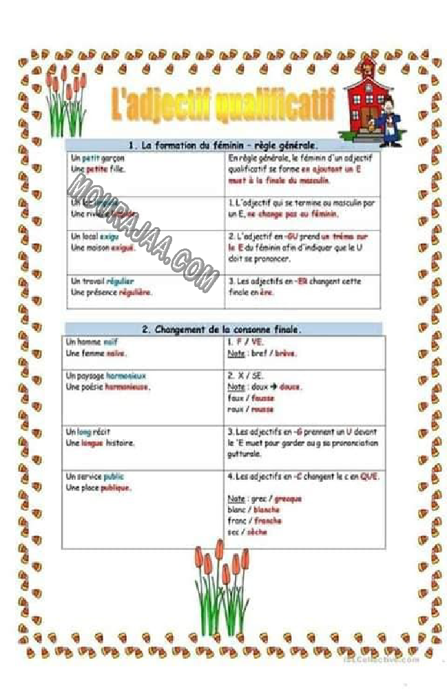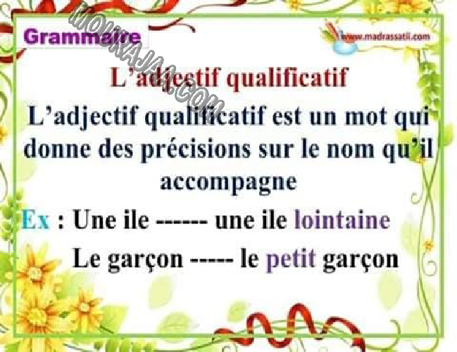 la leçon se deroule sur adjectif calificatifs pour aider l eleve de quatrieme annee primaire Pour revoir ses cours et examens en le téléchargeant sous forme de fichier ou en le visualisant sous forme d'images