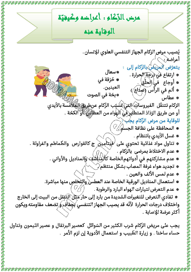 يتحدث الدرس على الزكام لمساعدة تلميذ سنة رابعة ابتدائي في مراجعة دروسه و امتحاناته و ذلك عبر تحميله في صيغة ملف او مشاهدته في صيغة صور